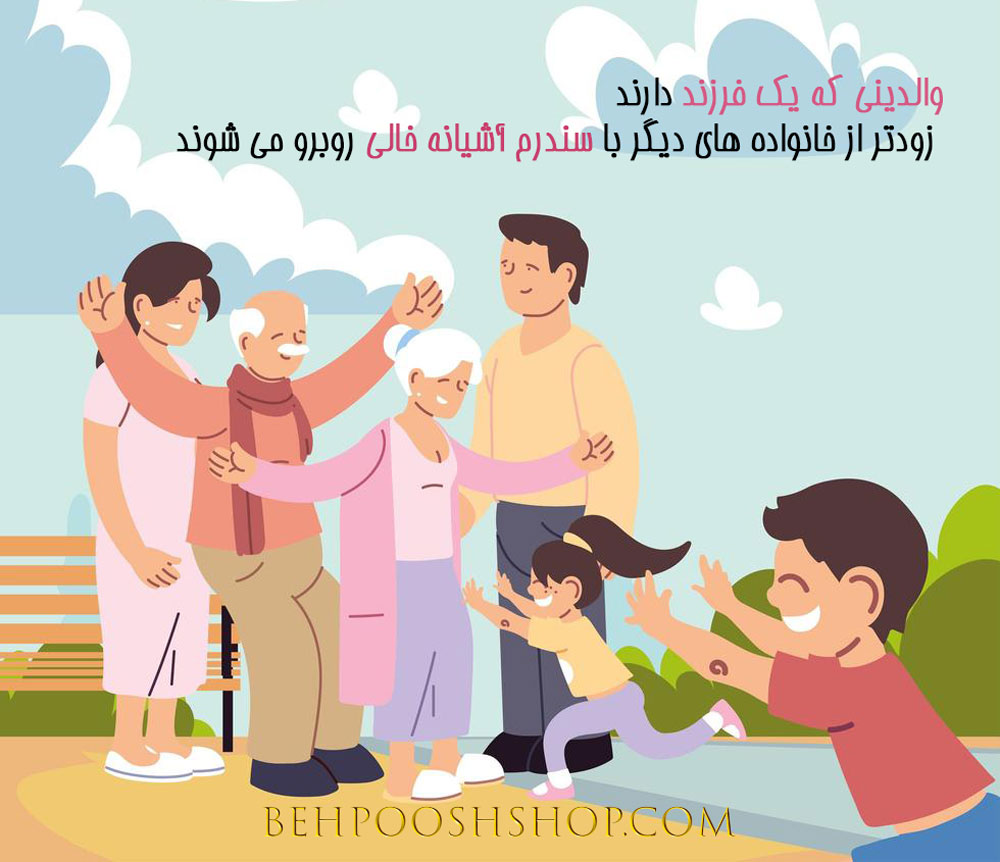 والدینی که یک فرزند دارند زودتر از خانواده های دیگر با سندرم آشیانه خالی روبرو می شوند و زمانی که تنها فرزندشان ازدواج کند و منزل پدری خود را ترک کند علائم افسردگی، احساس تنهایی، پوچی، بی هدفی، غم، تحریک پذیری بالا و … خواهند داشت. در حالیکه خانواده هایی که فرزند بیشتری دارند دیرتر گرفتار این موضوع می شوند و راحت تر آن را از سر می گذرانند.