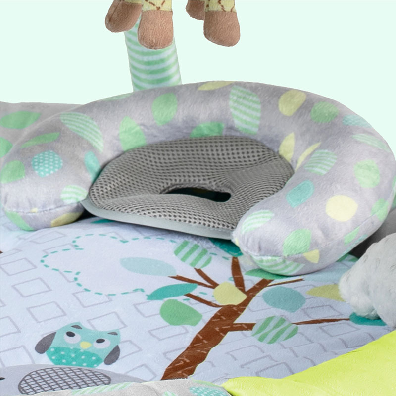 زمین بازی کودک دارای دو عروسک آویز، دو عروسک جغجغه دار، یک مکعب صدا دار و یک استوانه موزیکال می شود.