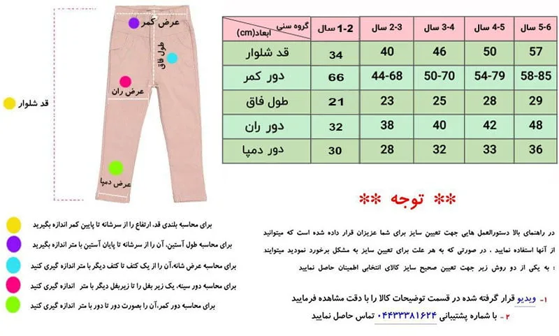 لطفا هنگام خرید حتما و حتما به سایز بندی کالای انتخابی خود و ابعاد اندازه گیری شده دقت فرماييد و این ابعاد را حتما و حتما با ابعاد بدنی يا نمونه لباس فرزند خود مقایسه نماييد تا خریدی مطمئن و بدون مرجوعی و رضایت بخش داشته باشید و اگر سوالی در رابطه با نحوه اندازه گیری ابعاد بدنی فرزند خود داشتید يا به مشكل برخورد كرديد لطفا با همکاران بخش فروشگاهی ما ( از طريق واتس اپ ) ارتباط برقرار نماييد .