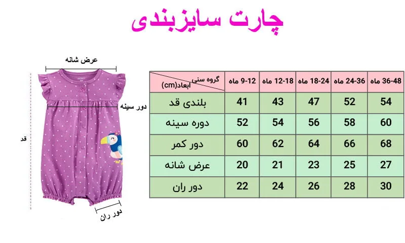 بهپوش شاپ برای افزایش کیفیت و سهولت در خرید برای مشتریان چارت دقیق سایز بندی طراحی کرده که مادر و پدر به راحتی میتوانند با مقایسه این اعداد با سایز لباس های خود کودک دقیق ترین خرید را برای جسه فرزند خود داشته باشند . در صورتی که در انتخاب سایز مورد نظر دچار شک و تردید شدید میتوانید از طریق واتس آپ با همکارانمون در ارتباط باشید