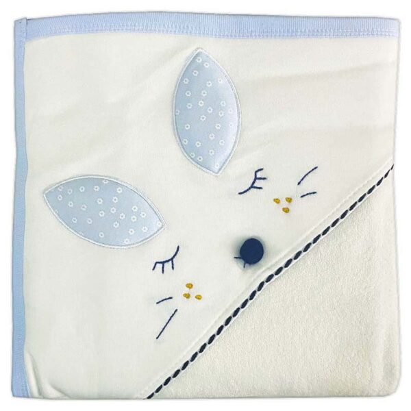 حوله چهارگوش کلاه دار طرح خرگوش آبی Gaye، یک ست حوله و لیف مناسب برای سیسمونی نوزادان است. سایز آن قابل استفاده برای نوزادان تا 2 سالگی می باشد.