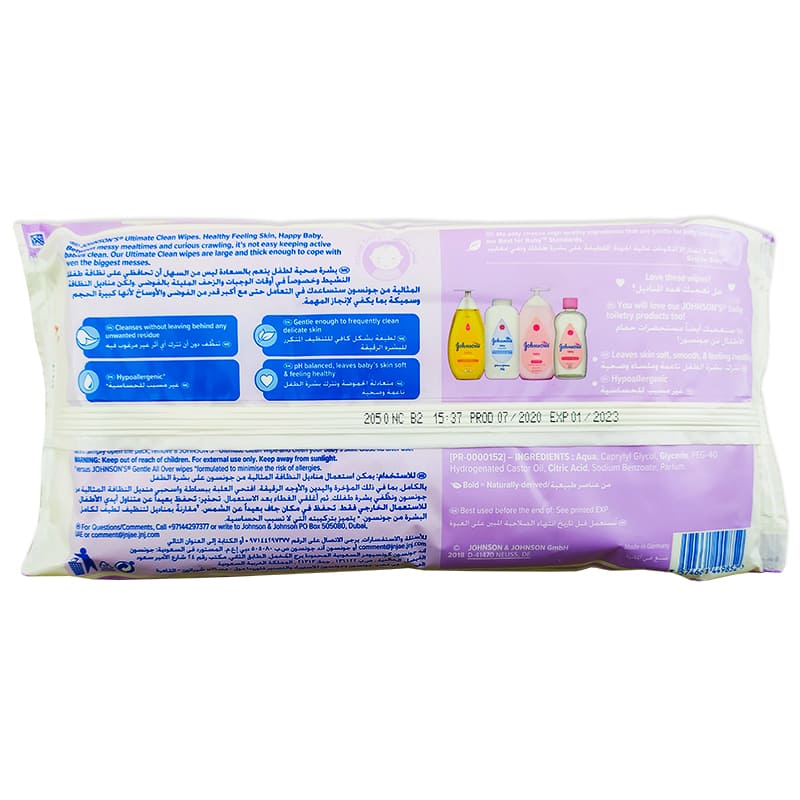 دستمال مرطوب درب دار 48 عددی، محصول شرکت جانسون Johnsons و ساخت کشور آلمان است. این محصول فاقد الکل و صابون است و PH آن متناسب با پوست حساس کودک می باشد و رطوبت طبیعی پوست را حفظ می کند.