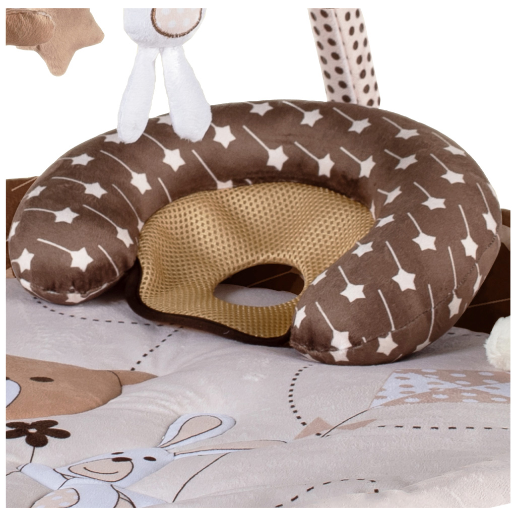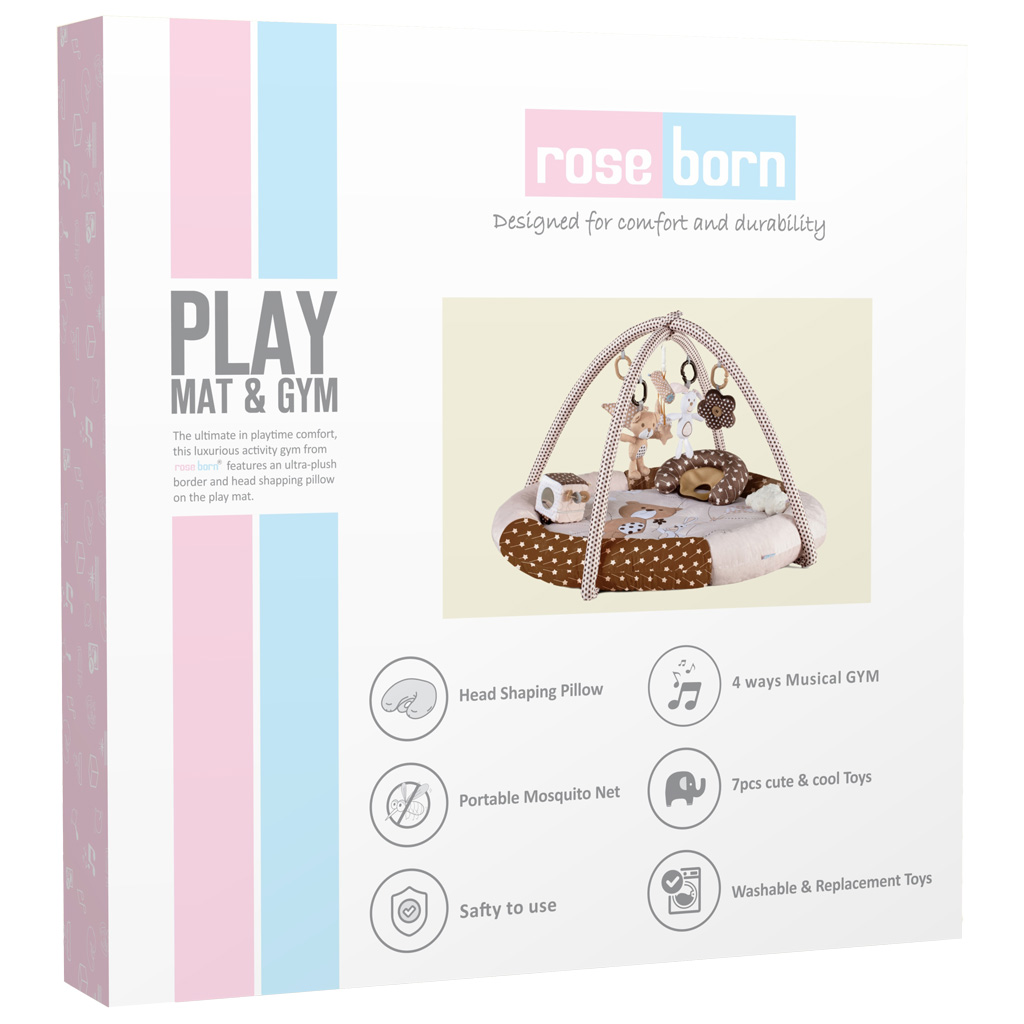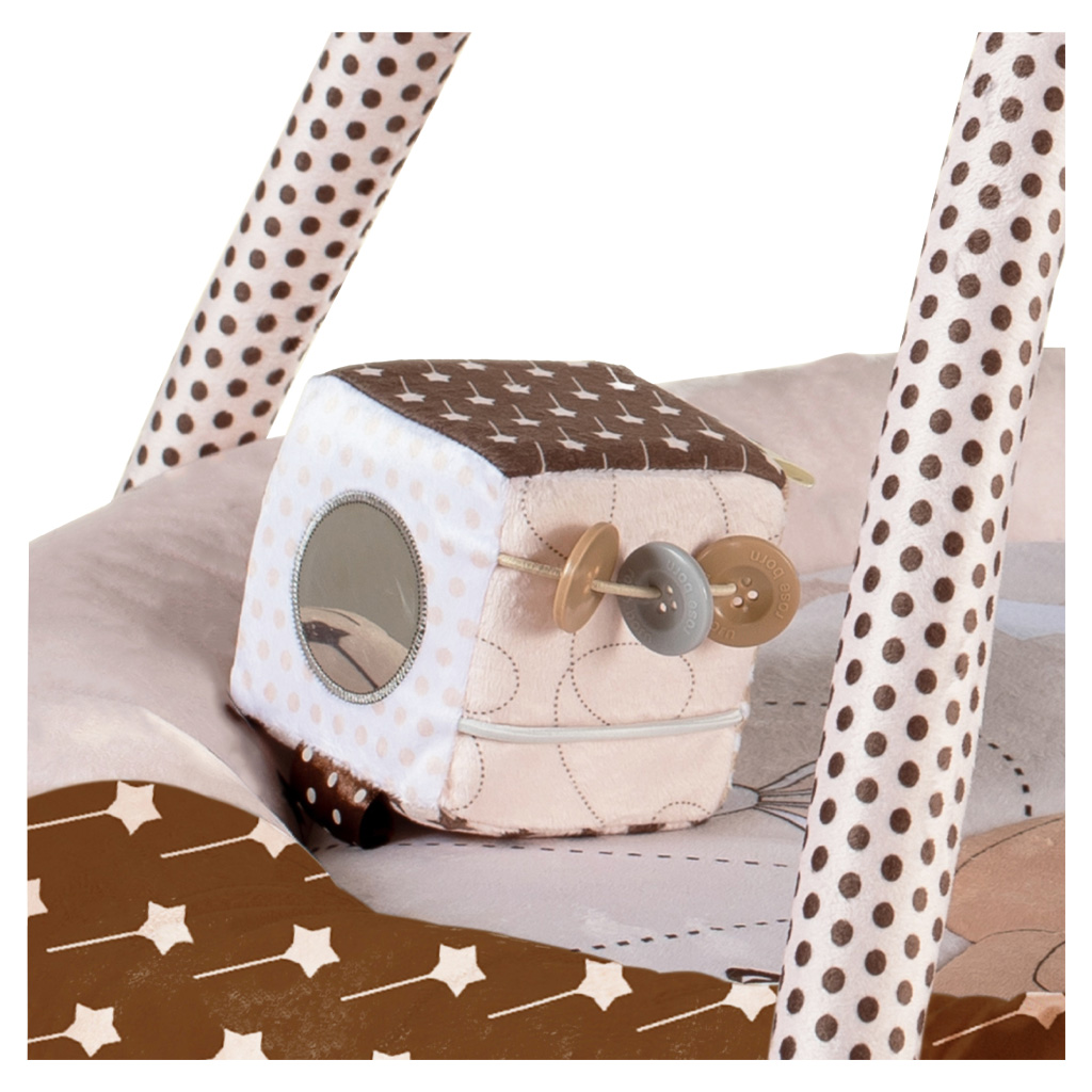 زمین بازی گرد گارددار Bear&Kite رزبرن RoseBorn، از جنس تشک مخمل ضد حساسیت و نانو تولید شده و دارای یک بالش فرم دهی و تور پشه بند نیز می باشد. این باشگاه ورزشی کودکانه علاوه بر سرگرم کردن کودک، به تقویت حواس و رفتار حرکتی او نیز کمک می کند.