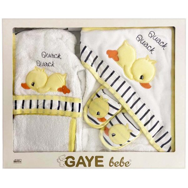 ست حوله چهارتکه طرح اردک محصول شرکت گایه Gaye ساخت کشور ترکیه می باشد. اندازه سرویس حوله برای نوزادان از بدو تولد تا 2 سالگی قابل استفاده است.