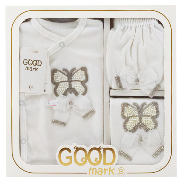 ست 5 تکه بیمارستانی نوزاد طرح پروانه و پاپیون شیری محصول برند ایرانی و با کیفیت شرکت گود مارک GoodMark می باشد.