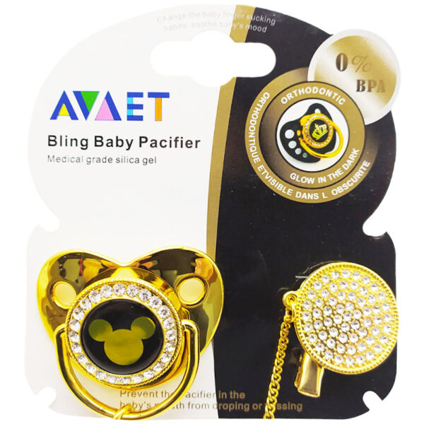 پستانک ارتودنسی نگینی زنجیردار میکی اویتAVAET، یک پستانک شیک و لاکچری مناسب برای استفاده در مهمانی ها و مجالس است.