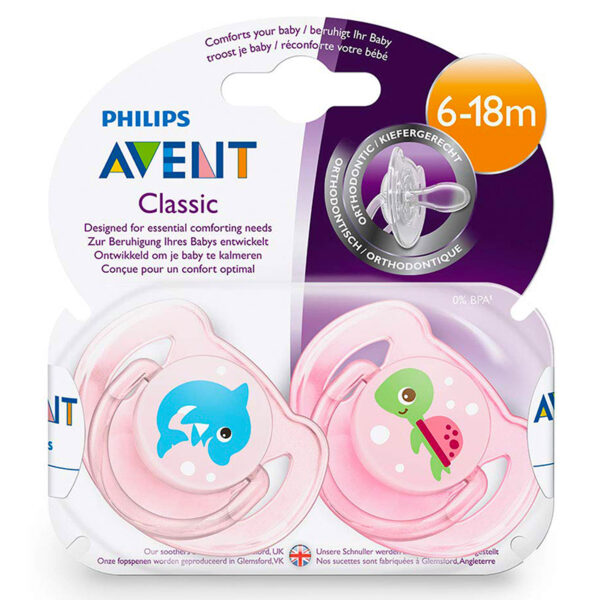 پستانک دو عددی کلاسیک سایز 6-18 ماه طرح دلفین و لاک پشت محصول شرکت انگلیسی فیلیپس اونت PHILIPS AVENT می باشد.