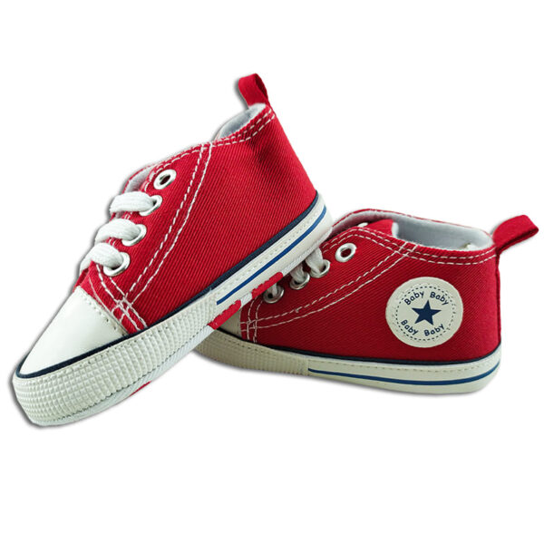 کفش نوزادی طراحی زیبا و جذابی برا ی نوزادان دارد و فوق العاده شیک و در عین حال اسپورت می باشد. پاپوش نوزادی جنس با کیفیت و با دوامی دارد. پاپوش آل استار قرمز دارای سایز بندی برای کودکان از سایز صفر تا هجده ماه است.